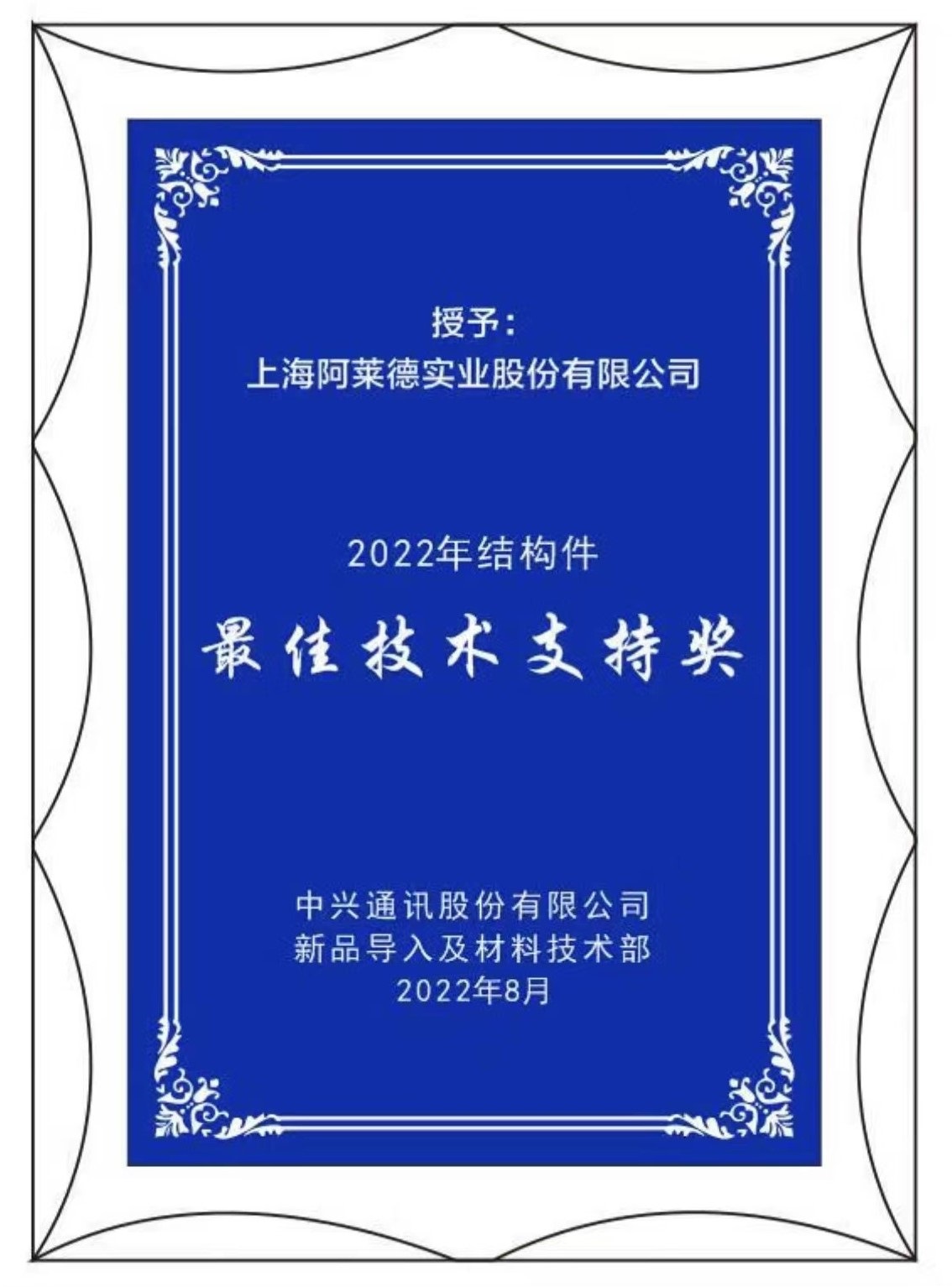此番獲評中興2022年結(jié)構(gòu)件“最佳技術(shù)支持獎”是客戶端對阿萊德綜合能力的肯定,也是阿萊德在高新技術(shù)領(lǐng)域蓬勃發(fā)展的佐證。