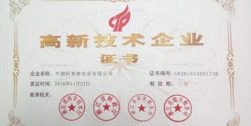 201 2017平湖阿萊德實(shí)業(yè)有限公司順利通過(guò)“國(guó)家高新技術(shù)企業(yè)”認(rèn)定
